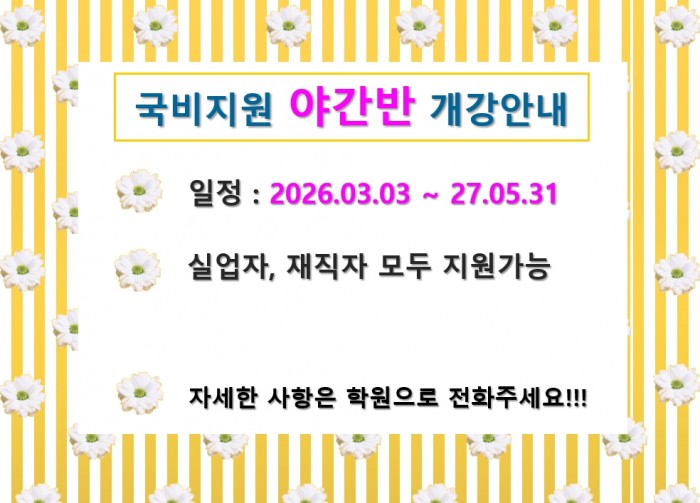 2026년 국비지원 야간반 모집안내입니다. 자세한 사항은 공지사항을 참고하세요!!!